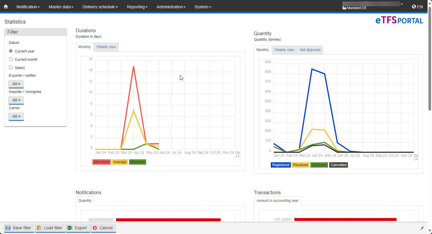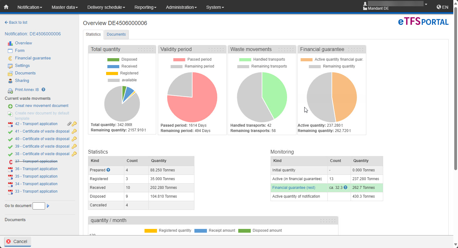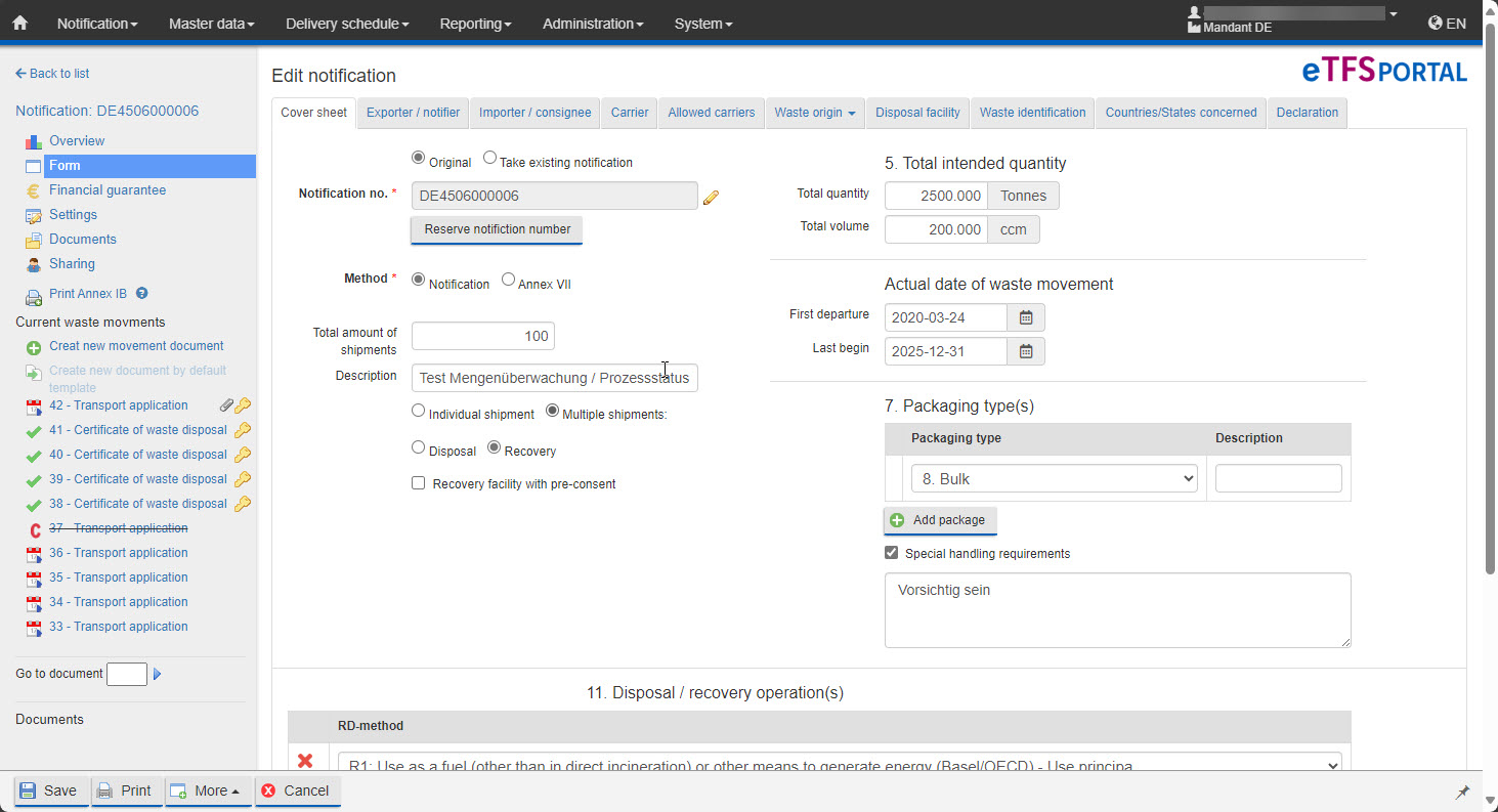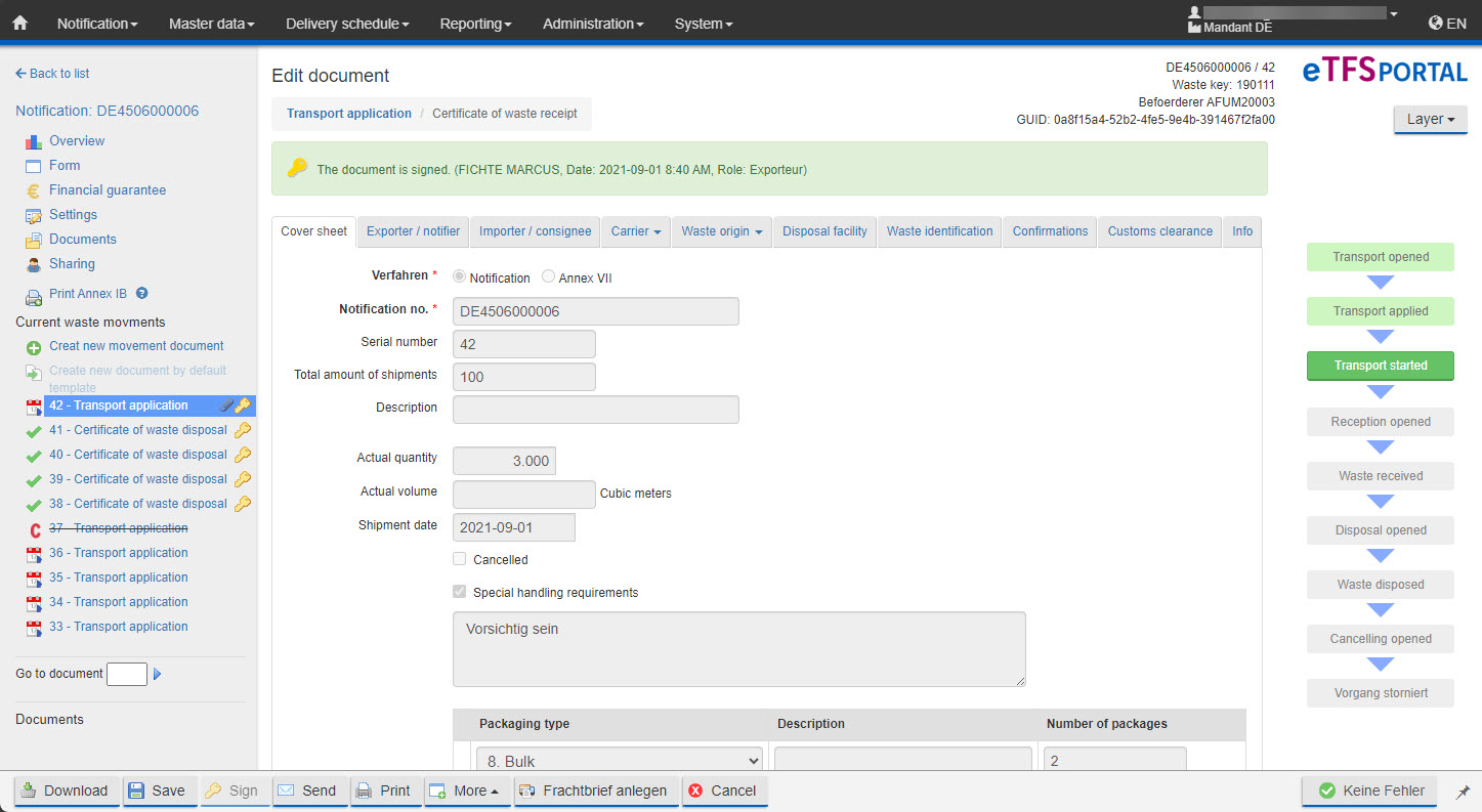 Our software solution supports the management of notifications and transport processes based on the new electronic standards. Transports can already be transmitted electronically according to the green list (Annex VII) and yellow list (Annex IB).